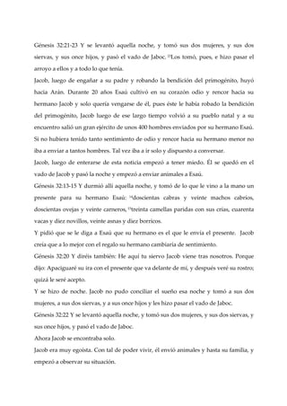 1. Jacob se quedó solo después de enviar a su familia y posesiones al otro lado del río Jaboc para encontrarse con su hermano Esaú, del que tenía miedo. 2. Jacob luchó toda la noche con un varón, que resultó ser Dios, hasta que amaneció. 3. Dios tocó el muslo de Jacob durante la lucha, dislocándoselo, para quebrantar su orgullo y enseñarle que no podía valerse por sí mismo.