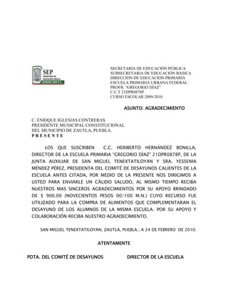 El director y la comisión de acción social de la Escuela Primaria Federal "Gregorio Díaz" solicitan al presidente municipal del municipio de Zautla, Puebla su apoyo para donar balones de basquetbol para un evento por el Día del Padre. Agradecen al presidente municipal por su apoyo de $900 pesos para la compra de alimentos que complementarán el desayuno de los alumnos.