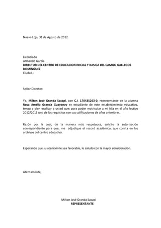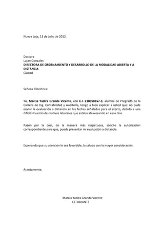 Marcia Yadira Granda Vicente solicita autorización para presentar una evaluación a distancia fuera de fecha debido a dificultades laborales. Milton José Granda Sacapi solicita el record académico de su hija Rosa Amelia Granda Guayanay para poder matricularla en el nuevo año escolar, ya que es un requisito. Ambos envían cartas formales explicando su situación y solicitando la autorización correspondiente.