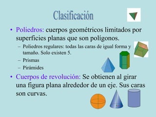 Este documento describe diferentes figuras tridimensionales, incluyendo poliedros (cuerpos geométricos limitados por superficies planas), poliedros regulares (que tienen caras, aristas y ángulos iguales), prisma (que tienen dos caras paralelas y caras laterales paralelogramos), pirámides (que tienen una sola cara por base y caras laterales triangulares), y cuerpos de revolución como cilindros (obtenidos al girar un rectángulo), conos (obtenidos al girar un triángulo rectá