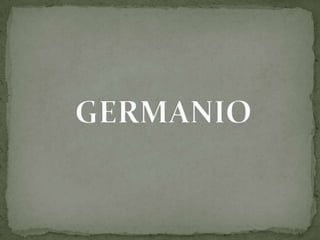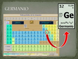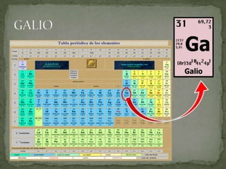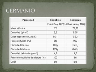 Este documento lista tres sólidos: silicio, germanio y galio. El silicio es un elemento semi-metálico gris azulado a temperatura ambiente. El germanio es un metaloide blanco grisáceo y quebradizo. El galio es un metal blando que se funde justo por encima de la temperatura ambiente y flota en su forma líquida.