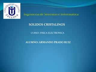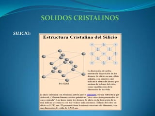 Este documento describe las propiedades y aplicaciones de tres materiales cristalinos: silicio, germanio y galio. El silicio se utiliza ampliamente en la electrónica debido a sus propiedades semiconductoras, mientras que el germanio y el galio se usan en aplicaciones como fibra óptica, circuitos integrados, diodos láser y termómetros.
