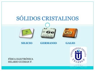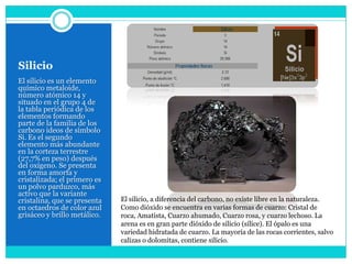 El documento describe las propiedades del silicio, germanio y galio. El silicio es el segundo elemento más abundante en la corteza terrestre y se utiliza ampliamente en la industria electrónica. El germanio es un semiconductor que responde bien a la radiación infrarroja. El galio es un metal blando que se funde cerca de la temperatura ambiente y se usa en semiconductores y termómetros médicos.