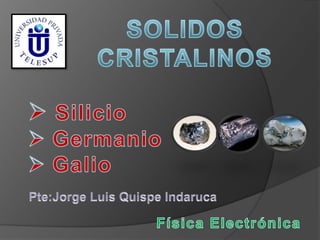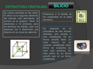 El silicio es el segundo elemento más abundante en la Tierra después del oxígeno. Se presenta de forma amorfa o cristalizada, y se utiliza ampliamente en la electrónica y en materiales como el vidrio. El germanio es un metaloide blanco grisáceo que es semiconductor empleado en transistores. El galio es un metal blando grisáceo que funde cerca de la temperatura ambiente, y se usa en circuitos electrónicos y termómetros.