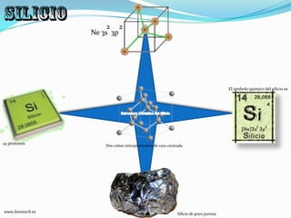 El documento presenta información sobre el silicio, germanio y galio, concentrándose en sus propiedades químicas y aplicaciones tecnológicas. El silicio, utilizado en chips y células fotovoltaicas, tiene un punto de fusión de 1687 grados Kelvin, mientras que el germanio, un semiconductor descubierto en 1886, se emplea en la detección de radiación gamma. El galio, con aplicaciones en dispositivos de estado sólido y células solares, pertenece a los metales del bloque p de la tabla periódica.