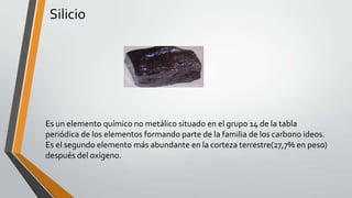 El documento trata sobre tres elementos cristalinos: silicio, germanio y galio. El silicio es el segundo elemento más abundante en la corteza terrestre y se presenta en forma amorfa y cristalina. Se usa en cerámicas, vidrios, electrónica y más. El germanio tiene una estructura cristalina similar al diamante y es un semiconductor usado en fibra óptica y electrónica. El galio es un metal blando que se funde cerca de la temperatura ambiente y se usa en termómetros, aleaciones y medicina