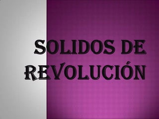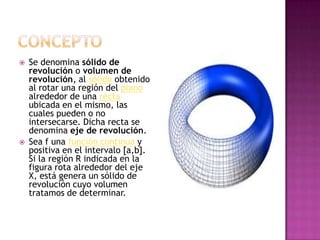 Este documento describe cómo calcular el volumen de un sólido de revolución usando el método de discos. Explica que si se rota una función alrededor de un eje, la integral de 2πrf(x)dx entre los límites calcula el volumen generado, donde r es el radio y f(x) la altura. También cubre cómo calcular volúmenes con cavidades y rotaciones alrededor de otros ejes.