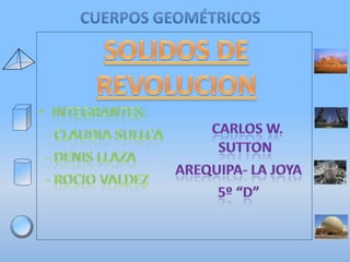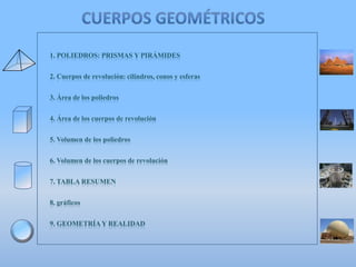 El documento presenta información sobre diferentes poliedros (prismas, pirámides), cuerpos de revolución (cilindros, conos, esferas) y sus propiedades geométricas como área y volumen. Incluye fórmulas para calcular el área lateral, de la base, total y volumen, así como una tabla resumen y ejemplos gráficos.