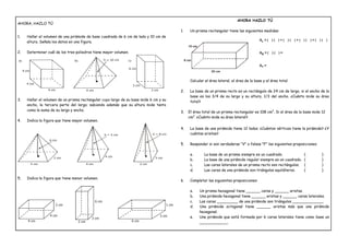 El documento presenta una serie de ejercicios relacionados con el cálculo del área lateral, total y volumen de prismas y pirámides. Incluye preguntas sobre el número de vértices, aristas y caras de estas figuras geométricas, así como cálculos con datos específicos sobre las dimensiones de prismas y pirámides. También asigna una tarea doméstica con ejercicios similares.