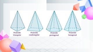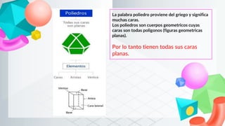 El documento habla sobre los diferentes tipos de cuerpos geométricos sólidos, incluyendo poliedros regulares como el tetraedro, cubo, octaedro, dodecaedro e icosaedro, así como prismas, pirámides, cilindros y esferas. Explica las características de cada uno, como el número de caras, aristas y vértices.