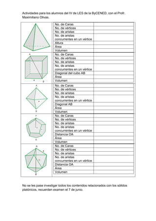 El documento presenta una lista de propiedades geométricas como el número de caras, vértices, aristas y aristas concurrentes en un vértice, así como medidas como la altura, diagonal, área y volumen de varios sólidos platónicos. El profesor Maximiliano Olivas asigna esta tarea a sus alumnos del IV grado de la escuela ByCENED para que investiguen los sólidos platónicos de cara al examen del 7 de junio.