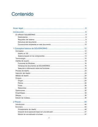 Este documento introduce SOLIDWORKS, un software de diseño 3D basado en componentes. Explica conceptos clave como el diseño en 3D, sistemas basados en componentes y la interfaz de usuario. Además, describe los pasos del proceso de diseño como croquis, planos, cotas y relaciones, y cómo crear piezas, ensamblajes y dibujos. Finalmente, cubre tareas de ingeniería avanzadas como análisis de tensiones y animación de ensamblajes.