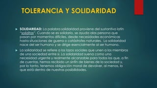 Este documento trata sobre la tolerancia y la solidaridad. Define la solidaridad como ayudar a los que necesitan sin esperar recompensa, y la tolerancia como respetar las diferencias de los demás. Explica que la solidaridad se basa en la igualdad humana y en la fraternidad, mientras que la tolerancia promueve la unidad entre las personas y la cooperación. Concluye que debemos practicar la tolerancia recordando que todos somos seres humanos, aunque también nos diferenciamos.