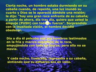 El documento cuenta la historia de un hombre al que Dios le ordenó empujar una gran roca frente a su cabaña cada día. A pesar de sus esfuerzos, la roca no se movía. Satanás intentó hacerle desistir diciéndole que su trabajo era en vano. Cuando el hombre le preguntó a Dios por qué había fallado, Dios le explicó que su tarea era empujar la roca para fortalecer su fe, no para moverla. Dios mismo movería la roca a su debido tiempo. La lección es que debemos obedecer