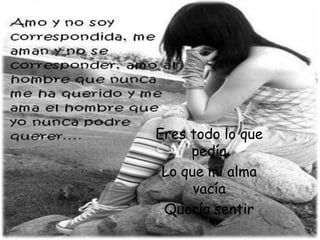 El documento es una carta de amor en la que el autor expresa que ha encontrado en la persona a la que se dirige todo lo que estaba buscando y necesitando. Dice que solo tiene ojos y corazón para esa persona y que se siente completo estando a su lado.