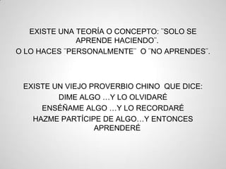 El documento discute la teoría de que "solo se aprende haciendo", citando un proverbio chino que dice que se olvida lo que se dice pero se recuerda lo que se hace. Argumenta que aunque esta teoría siempre ha existido, las escuelas no la aplican adecuadamente y en su lugar los profesores se concentran en lo que saben en lugar de ayudar a los estudiantes a aprender mediante la experiencia. Propone algunas pautas como aprender de manera práctica y divertida.