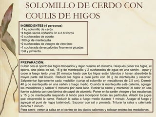 El documento proporciona varias recetas de solomillo de cerdo. La primera receta describe cómo preparar solomillo de cerdo con coulis de higos. Otras recetas incluyen solomillo con hongos, trenzas de solomillo con queso y pistachos, y solomillo agridulce con piña y ciruelas pasas.