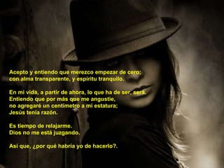Este documento trata sobre dejar ir el resentimiento y perdonarse a sí mismo para poder comenzar de nuevo con un corazón más joven y alma capaz de asombrarse. El autor elige soltar el control sobre los demás y aceptar lo que la vida le conduce, dejándose ir para poder recibir cosas nuevas.
