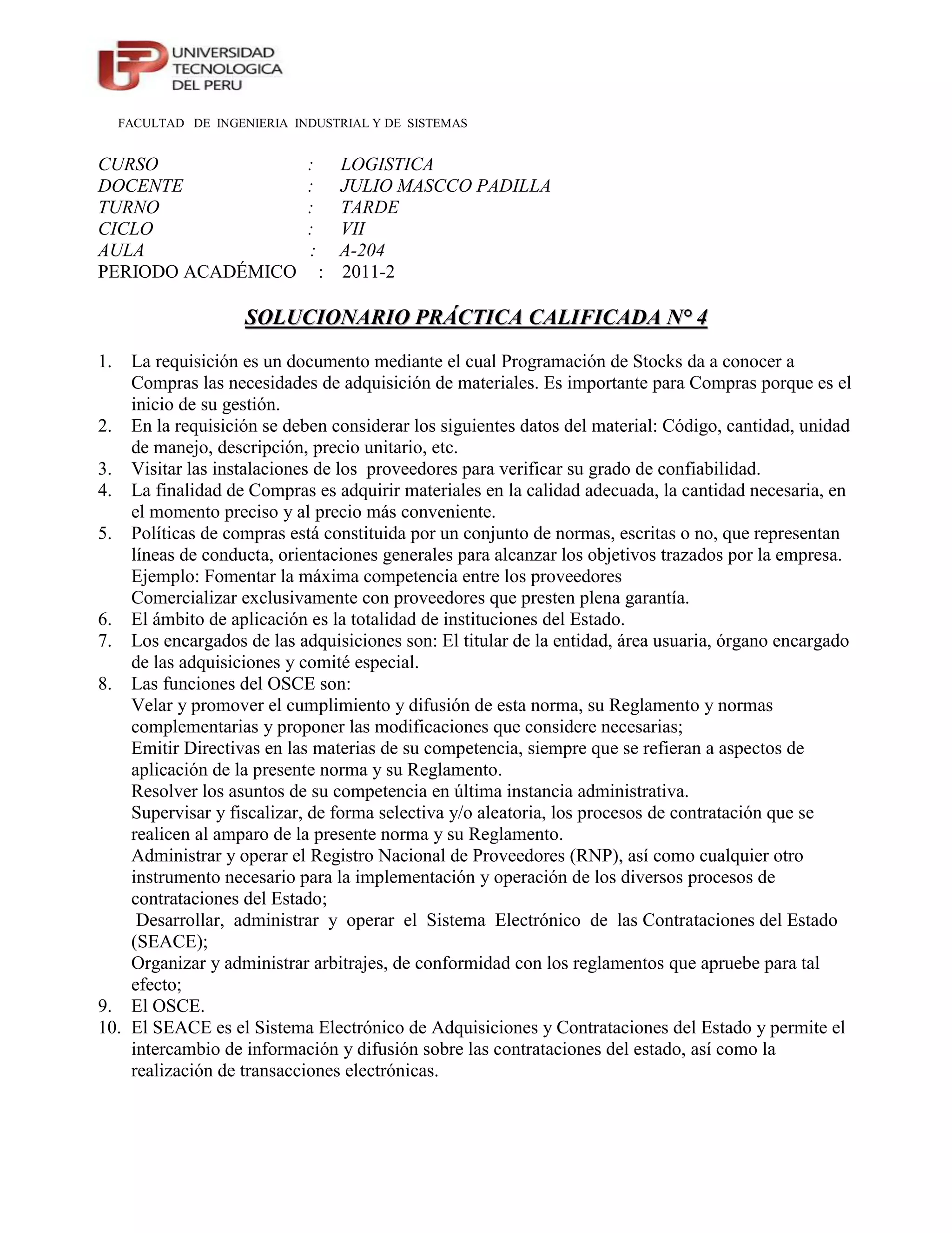 Este documento presenta un resumen de una práctica calificada sobre logística. Explica brevemente conceptos clave como requisición, compras, políticas de compras y los roles de la Oficina de las Naciones Unidas de Servicios para Proyectos y la plataforma electrónica SEACE en el proceso de adquisiciones del estado.