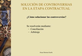 Este documento describe los diferentes tipos de medios alternativos de resolución de disputas contractuales como la conciliación y el arbitraje. Explica que la conciliación involucra la intervención de un tercero conciliador que facilita el diálogo entre las partes para lograr un acuerdo, mientras que el arbitraje es un mecanismo más formal donde un árbitro toma la decisión final. También señala que controversias como interpretación de contratos y adicionales de obra pueden resolverse mediante estos mecanismos.