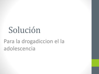El documento ofrece consejos para prevenir y abordar el abuso de drogas y alcohol en la adolescencia. Recomienda que los padres superen sentimientos como la preocupación o el enojo para brindar ayuda profesional, ya que el abuso puede conducir a problemas graves. Además, sugiere que los padres se mantengan informados sobre las drogas que circulan, se comuniquen claramente con sus hijos sobre el tema y establezcan la confianza necesaria para que los adolescentes se sientan cómodos siendo sinceros.