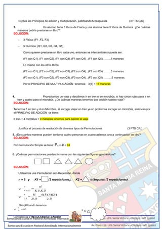 Este documento contiene un solucionario de evaluación de razonamiento matemático con 4 competencias. La primera competencia contiene ejercicios con factoriales y cantidades. La segunda trata sobre regularidad y cambio. La tercera y cuarta competencia contienen ejercicios resueltos sobre permutaciones y variaciones. El documento provee las soluciones detalladas a cada uno de los ejercicios propuestos.