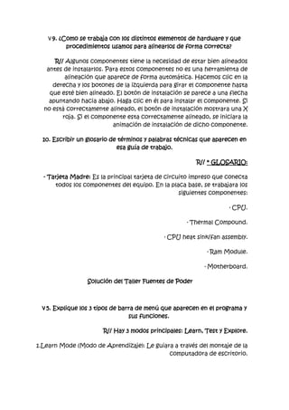 El documento explica los tres modos principales (Aprendizaje, Prueba y Explorar) de un programa para armar una computadora virtual. El modo de Aprendizaje guía al usuario a través de la instalación en 7 capas. El modo de Prueba ofrece todos los componentes sin instrucciones. El modo de Explorar proporciona 4 vistas internas y más información sobre los componentes. También describe cómo alinear correctamente los componentes usando botones antes de instalarlos. Incluye un glosario de términos técnicos como tarjeta