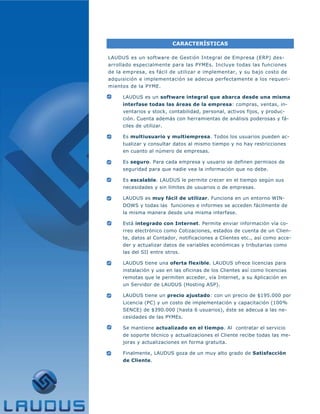 Laudus S.A. ofrece un software de gestión integral (ERP) diseñado para pymes, que abarca áreas como ventas, compras, contabilidad y producción, destacando su facilidad de uso y escalabilidad. El software permite multiusuarios, es seguro, y se adapta a las necesidades de las empresas con un costo accesible de implementación. Incluye funciones avanzadas de análisis y reportes, además de una opción de acceso remoto para mayor flexibilidad en la gestión de datos.