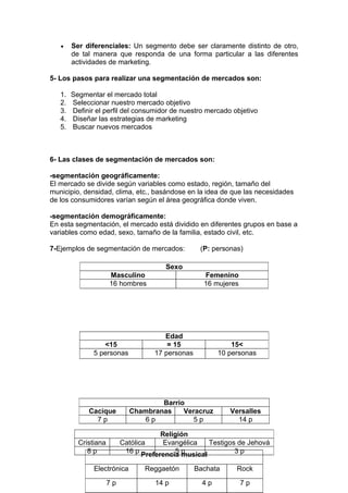 El documento describe los conceptos clave de segmentación de mercado. Explica que la segmentación de mercado implica dividir el mercado total en subgrupos distintos de clientes que comparten necesidades y comportamientos similares. Luego detalla los beneficios de la segmentación de mercado, las características de los segmentos, los pasos para realizar la segmentación y los tipos comunes de segmentación como la geográfica y demográfica. Finalmente, proporciona ejemplos de cómo segmentar un mercado según variables como sexo, edad, barrio y prefer
