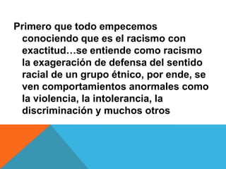 El documento define el racismo como la exagerada defensa del sentido racial de un grupo étnico que conduce a comportamientos anormales como la violencia y la intolerancia. Explica que las razones fundamentales por las que alguien puede desarrollar actitudes racistas son experiencias negativas previas con personas de otros grupos o haber aprendido esos comportamientos desde la infancia. Finalmente, propone que para combatir el racismo es necesario educar desde pequeños para aceptar a todos y dar buenos ejemplos basados en el respeto mutuo.