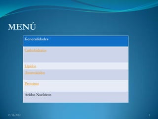 Este documento presenta una introducción a las biomoléculas, incluyendo carbohidratos, lípidos, aminoácidos y proteínas. Explica que las biomoléculas son las moléculas constituyentes de los seres vivos y están compuestas principalmente de carbono, hidrógeno, oxígeno y nitrógeno. Luego describe las características y clasificaciones de cada tipo de biomolécula.