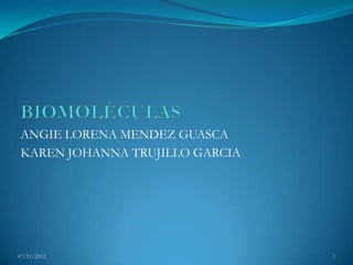 Este documento presenta una introducción a las biomoléculas, incluyendo carbohidratos, lípidos, aminoácidos y proteínas. Explica que las biomoléculas son las moléculas constituyentes de los seres vivos y están compuestas principalmente de carbono, hidrógeno, oxígeno y nitrógeno. Luego describe las características y clasificaciones de cada tipo de biomolécula.