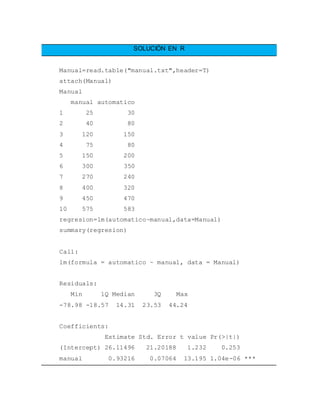 El documento presenta varios ejercicios de aplicación sobre regresión lineal. El primer ejercicio compara medidas manuales y automáticas de la concentración de nitratos en un lago, encontrando una alta correlación positiva entre los métodos. El segundo ejercicio estudia la relación entre el número de cuadrados dentro de cuadrados dibujados y el tamaño de su lado, hallando una relación lineal.