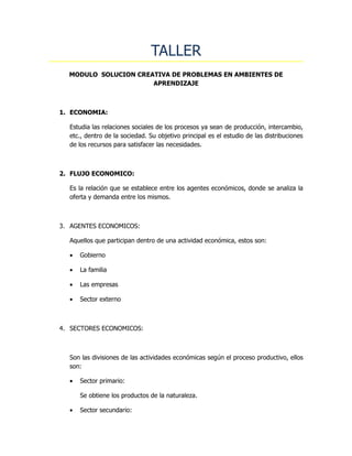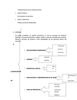 El documento describe conceptos clave relacionados con la economía y las empresas. Explica que la economía estudia las relaciones sociales de producción y distribución de recursos para satisfacer necesidades. También define los sectores económicos, agentes económicos, tipos de empresas y proceso de constitución legal de una empresa. Finalmente, cubre temas como organización, administración y áreas funcionales de una empresa.