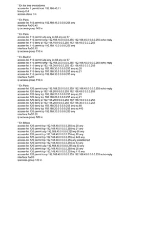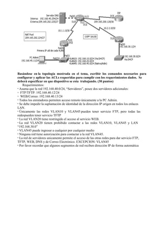 Este documento describe los requisitos para configurar ACLs (lists de control de acceso) en varios dispositivos de red para cumplir con los requerimientos de seguridad dados. Se especifican los comandos necesarios para permitir o denegar el tráfico entre diferentes redes VLAN y LAN de acuerdo a las políticas requeridas.