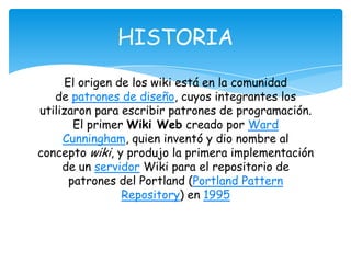 Los wikis se originaron como herramientas de escritura colaborativa utilizadas por comunidades de desarrolladores. Ward Cunningham creó el primer wiki web en 1995 para almacenar patrones de programación. Un wiki es un sitio web que permite a múltiples usuarios editar su contenido de forma rápida e interactiva a través de un navegador, lo que lo hace útil para la escritura colaborativa. Cada usuario que realiza un cambio puede ser identificado y se pueden recuperar versiones anteriores del contenido.