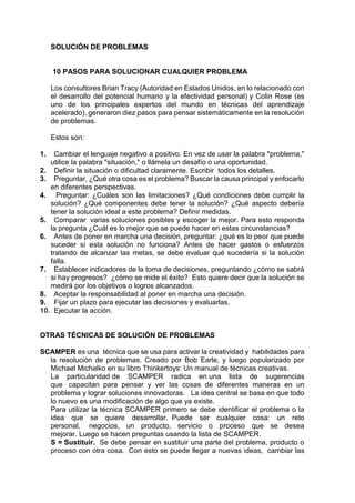 El documento presenta varias técnicas para la resolución de problemas, incluyendo los 10 pasos para pensar sistemáticamente en la resolución de problemas propuestos por Brian Tracy y Colin Rose, la técnica SCAMPER para generar ideas creativas, el uso del collage, el árbol de problemas para identificar causas y efectos, y la matriz FODA para analizar factores internos y externos. También describe el diagrama de Ishikawa para visualizar las posibles causas de un problema.