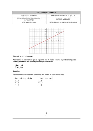 Este documento contiene la solución de un examen de matemáticas de 3er año de educación secundaria. El examen incluye 6 ejercicios sobre ecuaciones y sistemas de ecuaciones. Cada ejercicio está resuelto de manera detallada. El primer ejercicio involucra resolver dos ecuaciones. El segundo pide obtener tres puntos de una recta dada. El tercero representa dos rectas en un mismo plano y encuentra su punto de intersección.