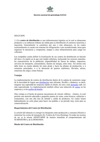 El documento proporciona instrucciones para realizar un modelo a escala de un centro de distribución como parte de un resultado de aprendizaje en el SENA. Se pide investigar sobre centros de distribución e incluir partes como pasillos, baños y oficinas en el modelo a construir, el cual no debe exceder 1 metro cuadrado. También se proporciona información histórica sobre el desarrollo de centros de distribución en Colombia y en otras partes del mundo a lo largo de los años.