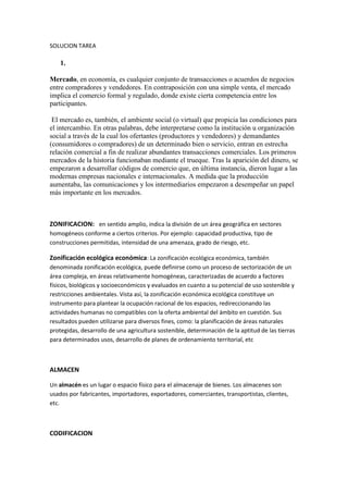 El documento habla sobre conceptos relacionados con el mercado, la zonificación, los almacenes, la codificación de caracteres, las estanterías y documentos como las órdenes de compra, facturas y salidas de almacén. Define cada uno de estos términos y describe sus características principales.