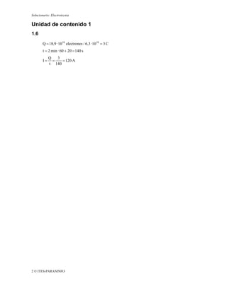 El solucionario contiene ejercicios resueltos de diferentes unidades de contenido relacionadas con Electrotecnia, incluyendo cálculos de corriente, resistencia, potencia y otros parámetros eléctricos. Los ejercicios cubren temas como circuitos eléctricos en serie y paralelo, leyes de Ohm, potencia eléctrica y cálculos térmicos, dimensionamiento de conductores e instalaciones el