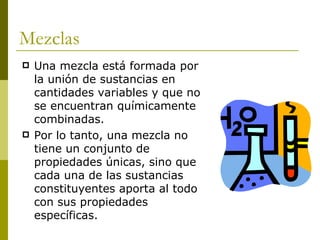 Este documento describe diferentes tipos de mezclas y soluciones químicas. Explica que una mezcla está formada por la unión de sustancias en cantidades variables que no están químicamente combinadas. Luego clasifica las mezclas en homogéneas y heterogéneas, y estas últimas en emulsiones, suspensiones y coloides. Finalmente, detalla los componentes y características de las soluciones químicas y diferentes formas de expresar su concentración.