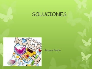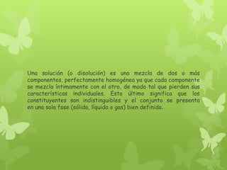 Una solución es una mezcla homogénea de dos o más componentes. Las soluciones se clasifican según su concentración en diluidas, concentradas, saturadas y sobresaturadas. La concentración de una solución se puede expresar en unidades físicas como porcentaje o en unidades químicas como molaridad. Las propiedades coligativas de una solución, como cambios en el punto de ebullición o congelación, dependen solo de la concentración del soluto y no de su identidad.