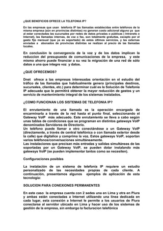 La telefonía IP permite realizar llamadas de voz a través de redes IP como Internet, ofreciendo beneficios como comunicaciones internas gratuitas y servicios de valor agregado. Funciona digitalizando la voz, comprimiéndola en paquetes de datos y enviándolos a través de redes IP, donde son descomprimidos de nuevo en voz. Requiere equipos como gateways para convertir entre señales de voz analógicas y digitales de datos IP.