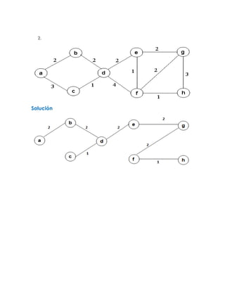 Este documento presenta dos problemas de determinar el árbol de mínima expansión para dos grafos dados utilizando el algoritmo de Kruskal. No se proporcionan detalles sobre los grafos, las aristas o los pasos del algoritmo de Kruskal aplicado a cada uno.