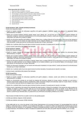 El documento describe los fundamentos y tipos de ensayos inmunoabsorbentes ligados a enzimas (ELISAs). Los ELISAs utilizan antígenos o anticuerpos marcados con una enzima para detectar la presencia de antígenos o anticuerpos mediante la adición de un sustrato que produce un color detectable. Existen varios tipos de ELISAs como sándwich, indirecto y competitivo que difieren en los pasos de adición de antígenos, anticuerpos y conjugados enzimáticos.