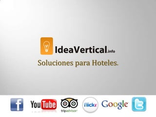 Este documento ofrece una variedad de soluciones de marketing y reservas para hoteles, incluyendo el desarrollo de sitios web, posicionamiento en buscadores, campañas publicitarias, redes sociales, video marketing, motores de reservas integrales, y análisis de métricas. También describe las características y beneficios del motor de reservas, como la creación de habitaciones y tarifas, métodos de pago, ofertas especiales, políticas de cancelación, y generación de bases de datos de clientes.