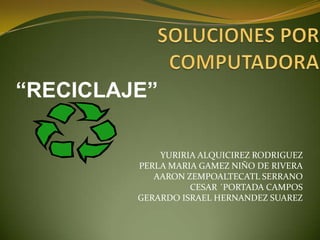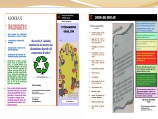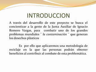 Este documento describe un proyecto de reciclaje en la Junta Auxiliar de Ignacio Romero Vargas para crear conciencia sobre la contaminación por desechos plásticos. El proyecto involucra identificar compradores de materiales reciclables, registrarse en programas de premios por reciclaje, establecer acuerdos con el departamento municipal de reciclaje, usar redes sociales para promover el centro de recolección, crear folletos informativos, y ofrecer cursos en línea sobre educación ambiental.
