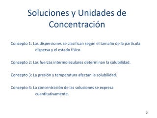 El documento resume cuatro conceptos clave sobre soluciones y unidades de concentración. Explica cómo las dispersiones se clasifican según el tamaño de partícula y estado físico, cómo las fuerzas intermoleculares determinan la solubilidad, cómo la presión y temperatura afectan la solubilidad, y cómo se expresa cuantitativamente la concentración de soluciones a través de porcentajes, partes por millón y molaridad.