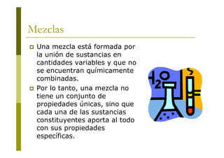 El documento describe las características de las mezclas y soluciones. Explica que las mezclas pueden ser homogéneas o heterogéneas dependiendo del tamaño de las partículas de la fase dispersa. También describe las diferentes formas de expresar la concentración de una solución química, incluyendo porcentaje en masa, molaridad, normalidad y molalidad.